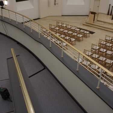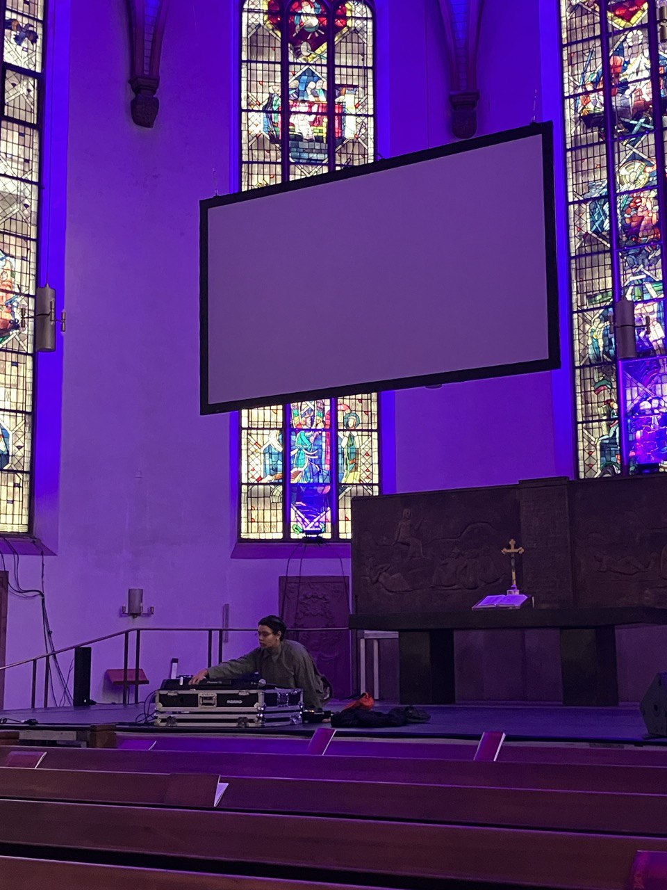 At the staircase at the lecterner: two speakers - screams ? Uncomfortable distorted noise, the middle four speakers hidden underneath the chairs sound like organs, slow sometimes a bit of Bach or it quiets down for Sunday service choir, appreciation for gospel music, moments of church communitylove beauty and spirituality - go upstairs the speaker on the railing asks :papa can you hear me ? The last speaker is positioned next to a little puppet - where the breasts should be there are slits, the eyes are Xs. The puppet lies on gras, flowers are positioned around him. You can only hear the sound of the last speaker if you put your ear really close and by that also to the puppet.Depending on the time you will hear Bach, Minnie Ripperton or Motherlode.